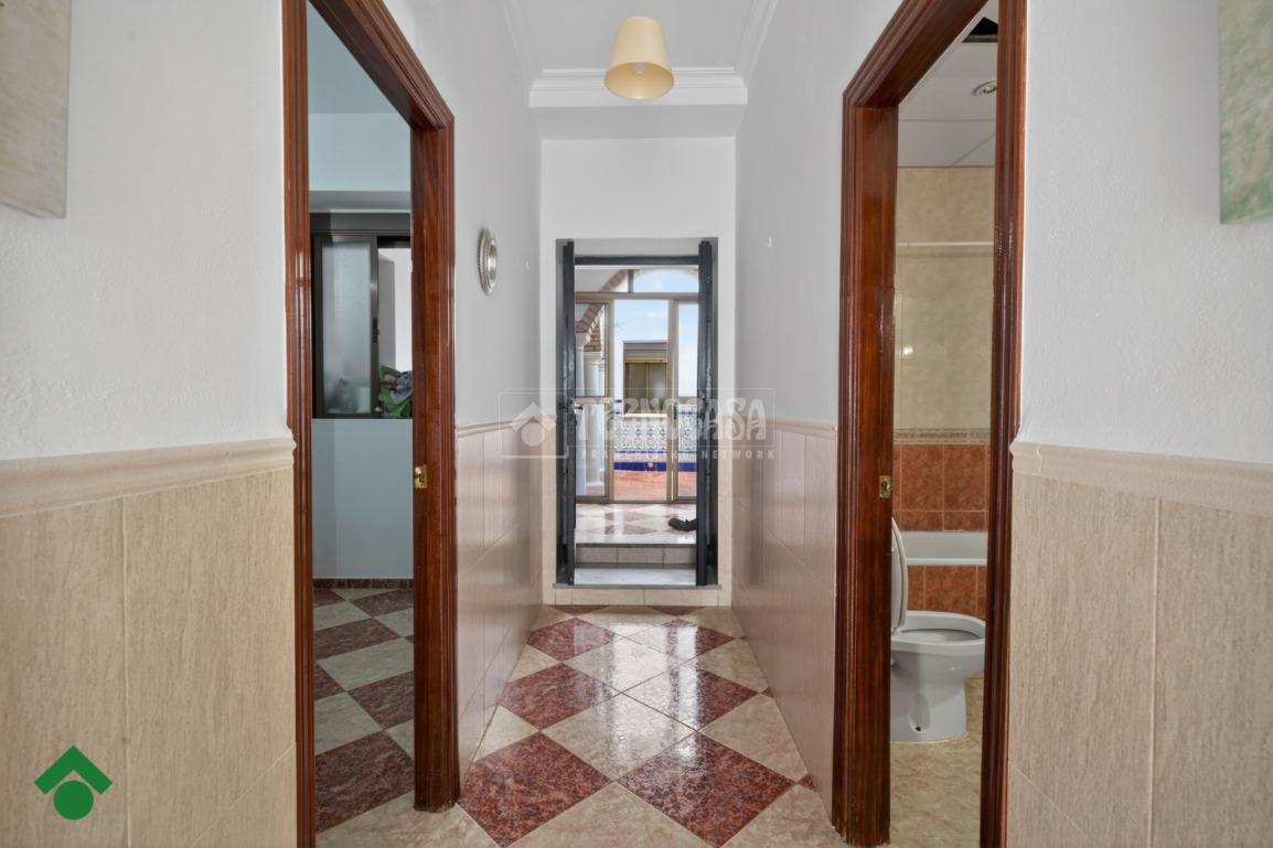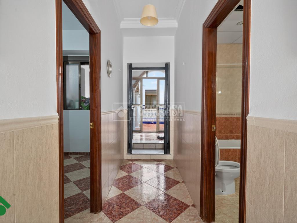 Continuando por el pasillo, a la derecha se encuentra el segundo baño, que dispone de bañera y ventana al patio, favoreciendo la ventilación natural. A la izquierda está el dormitorio principal, con ventana al patio y un práctico vestidor que aporta comodidad y espacio de almacenamiento.
