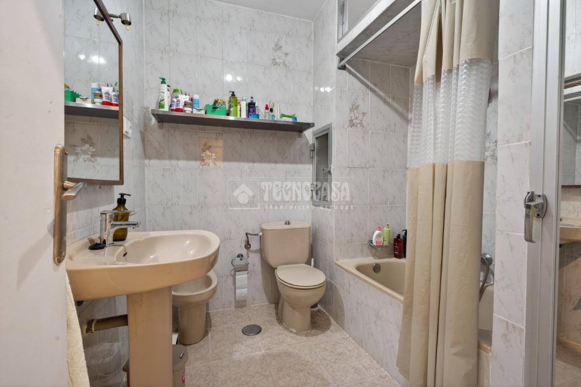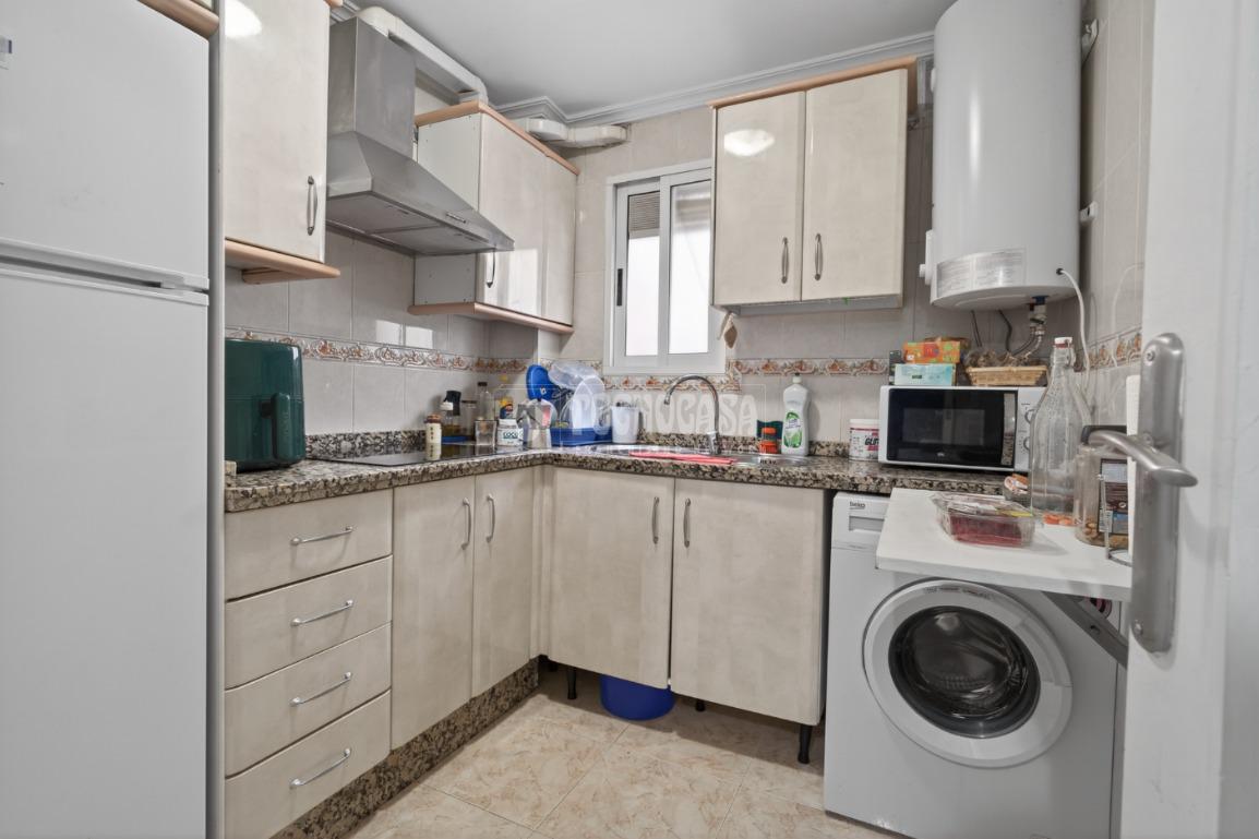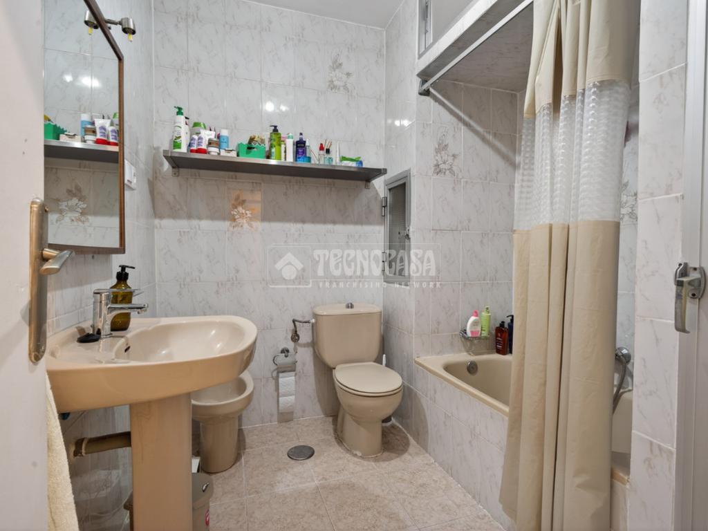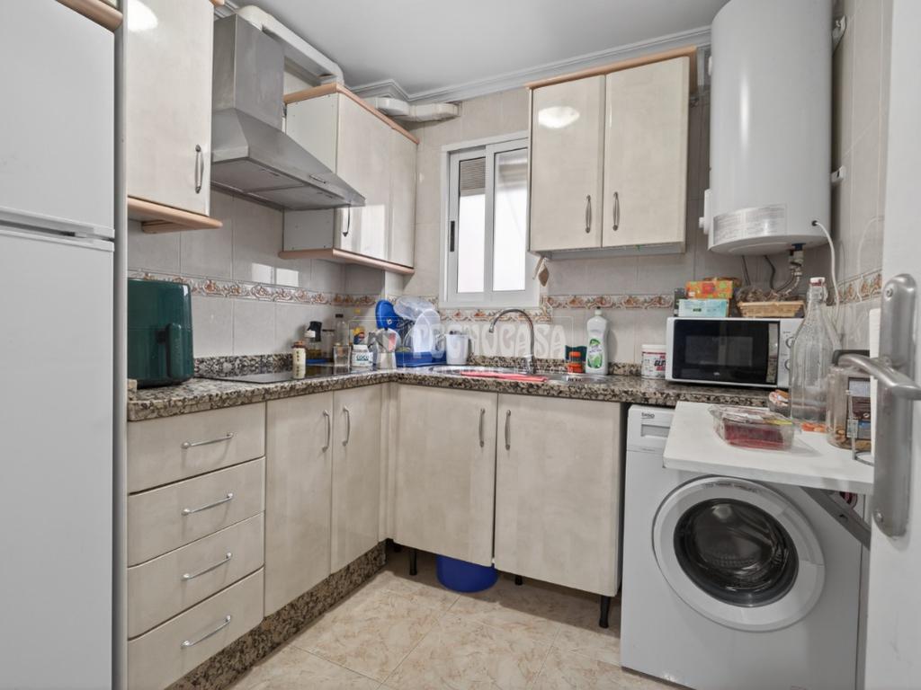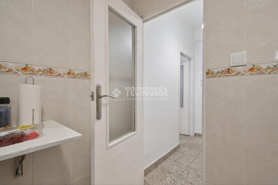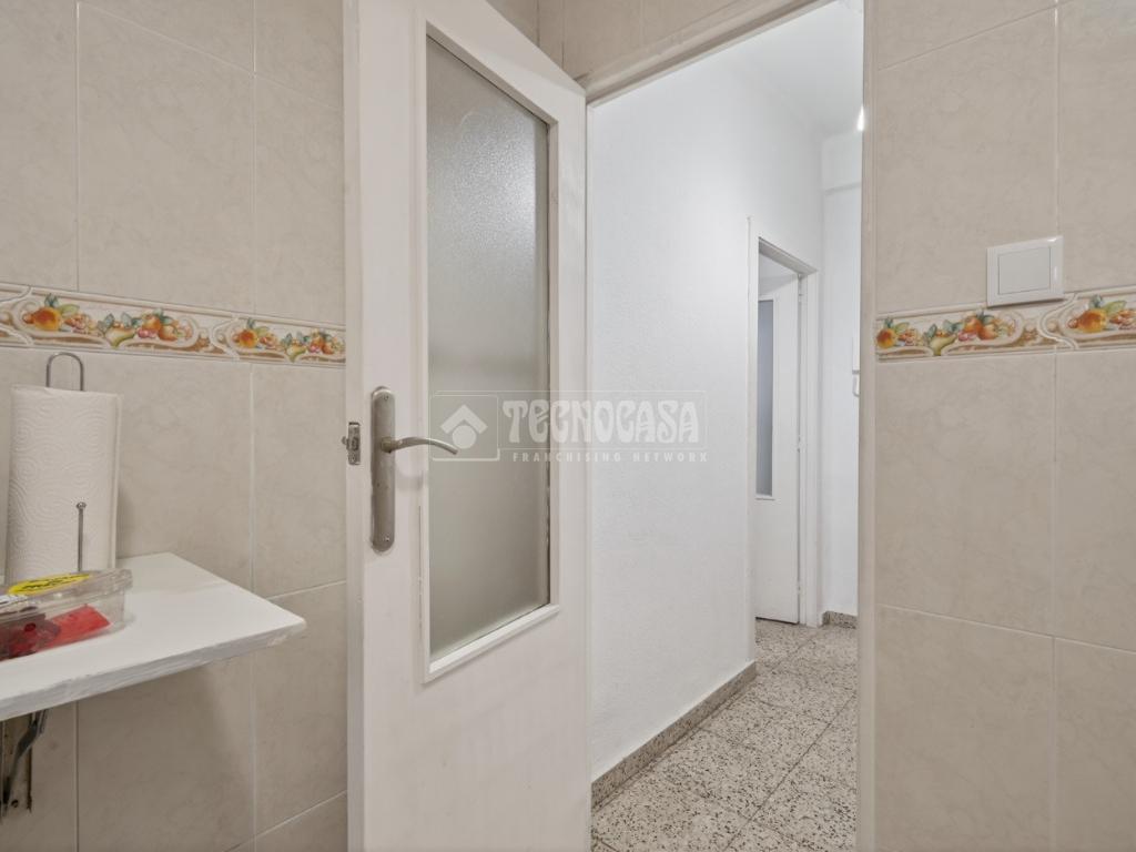 La cocina está amueblada y equipada, con ventana al patio interior, y el baño dispone de bañera y un armario empotrado para almacenamiento. Algunas habitaciones cuentan con ventilador de techo, las paredes son de gotelé y los cierres de aluminio simple.